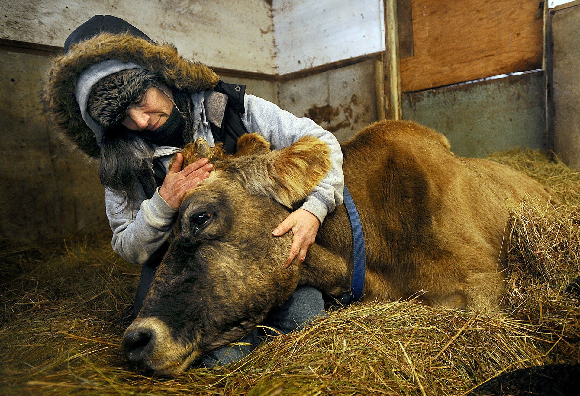 Georgette Jowdy, a worker at Eastleigh Farm in Framingham, cradles her beloved 22-year-old Jersey cow Peaches before the cow was euthanized by a veterinarian, Feb. 8, 2013.