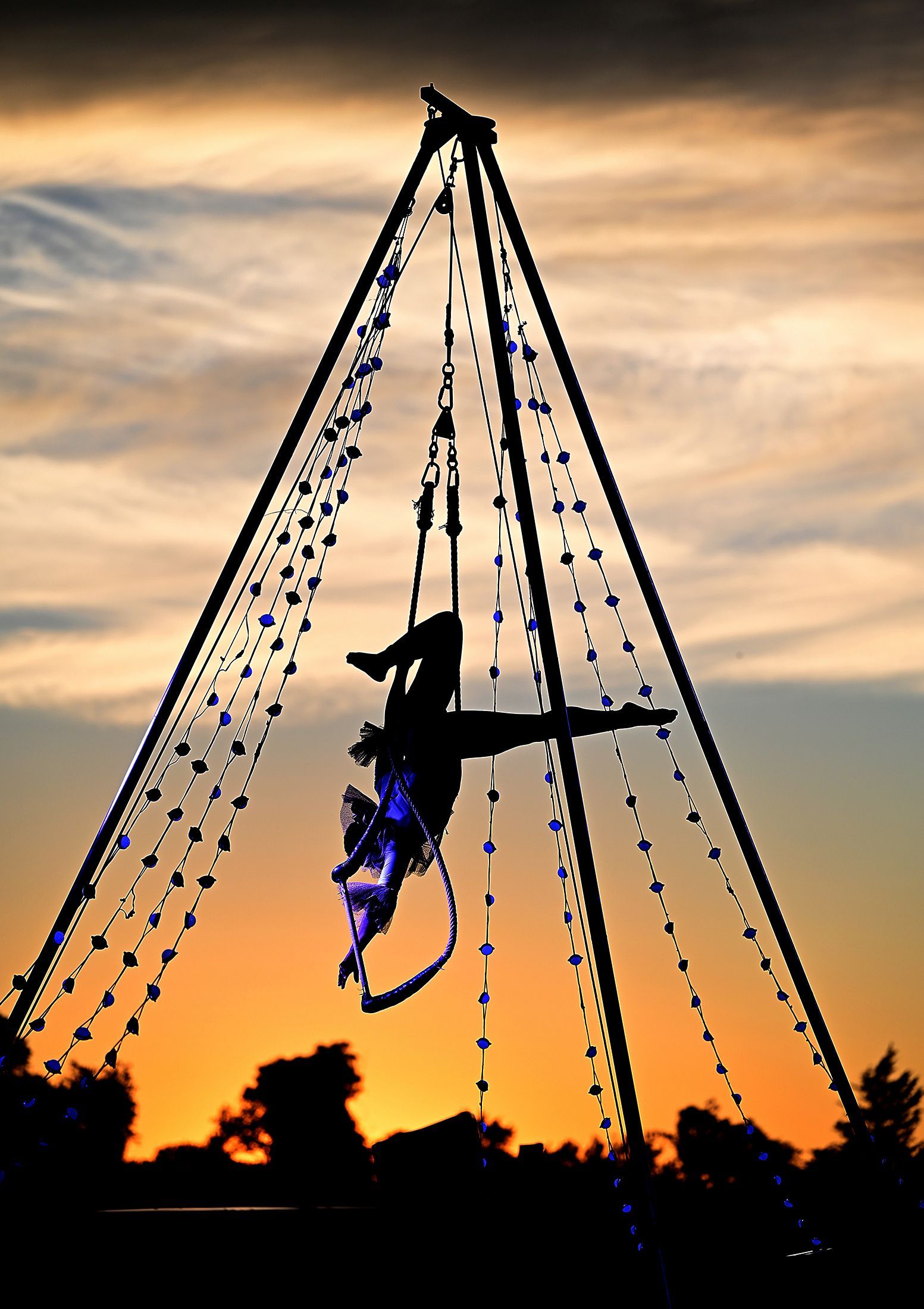As the sun sets at Eastleigh Farm in Framingham, aerialist Julia Baccellieri wows the audience, August 12, 2022.